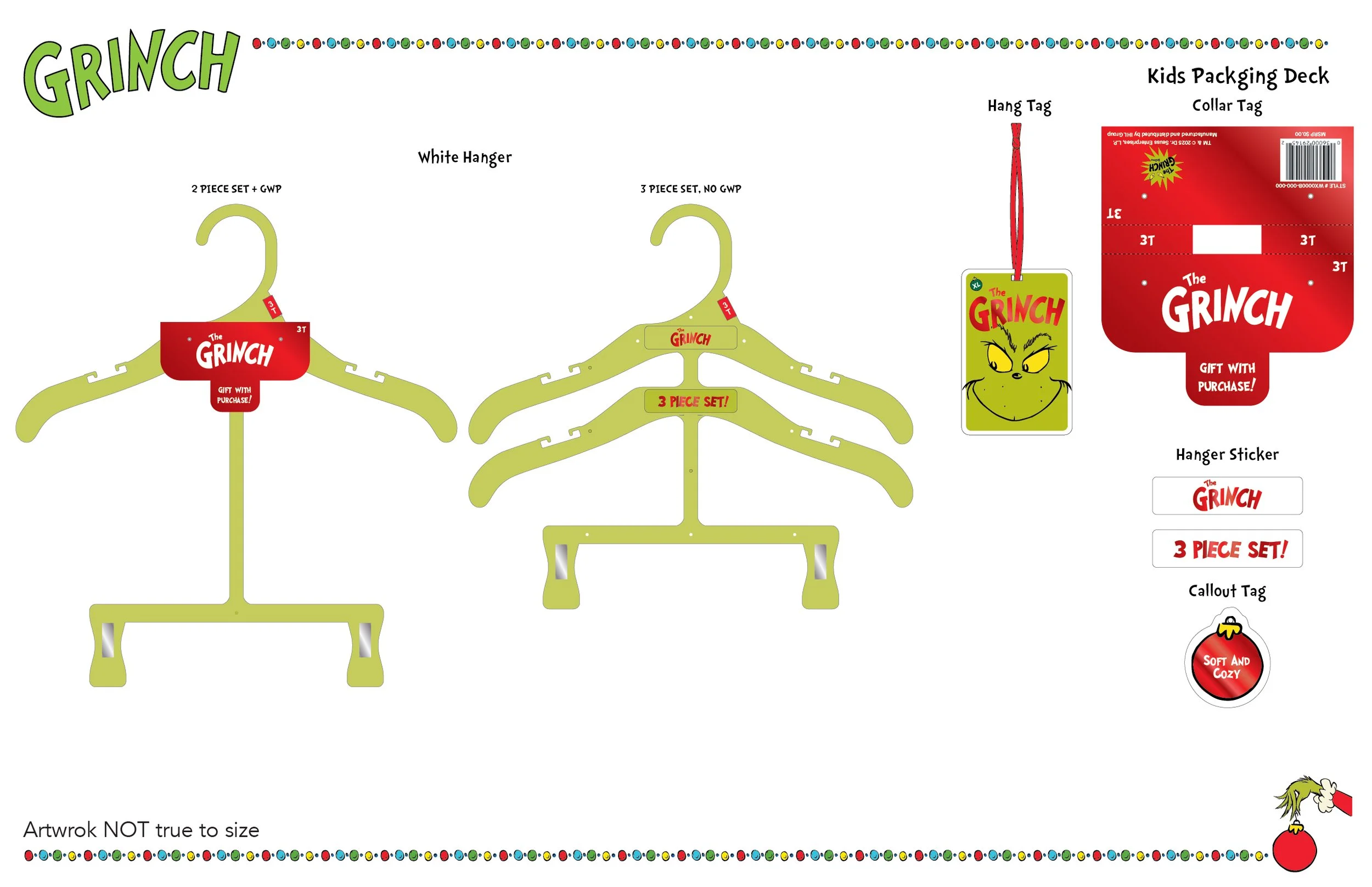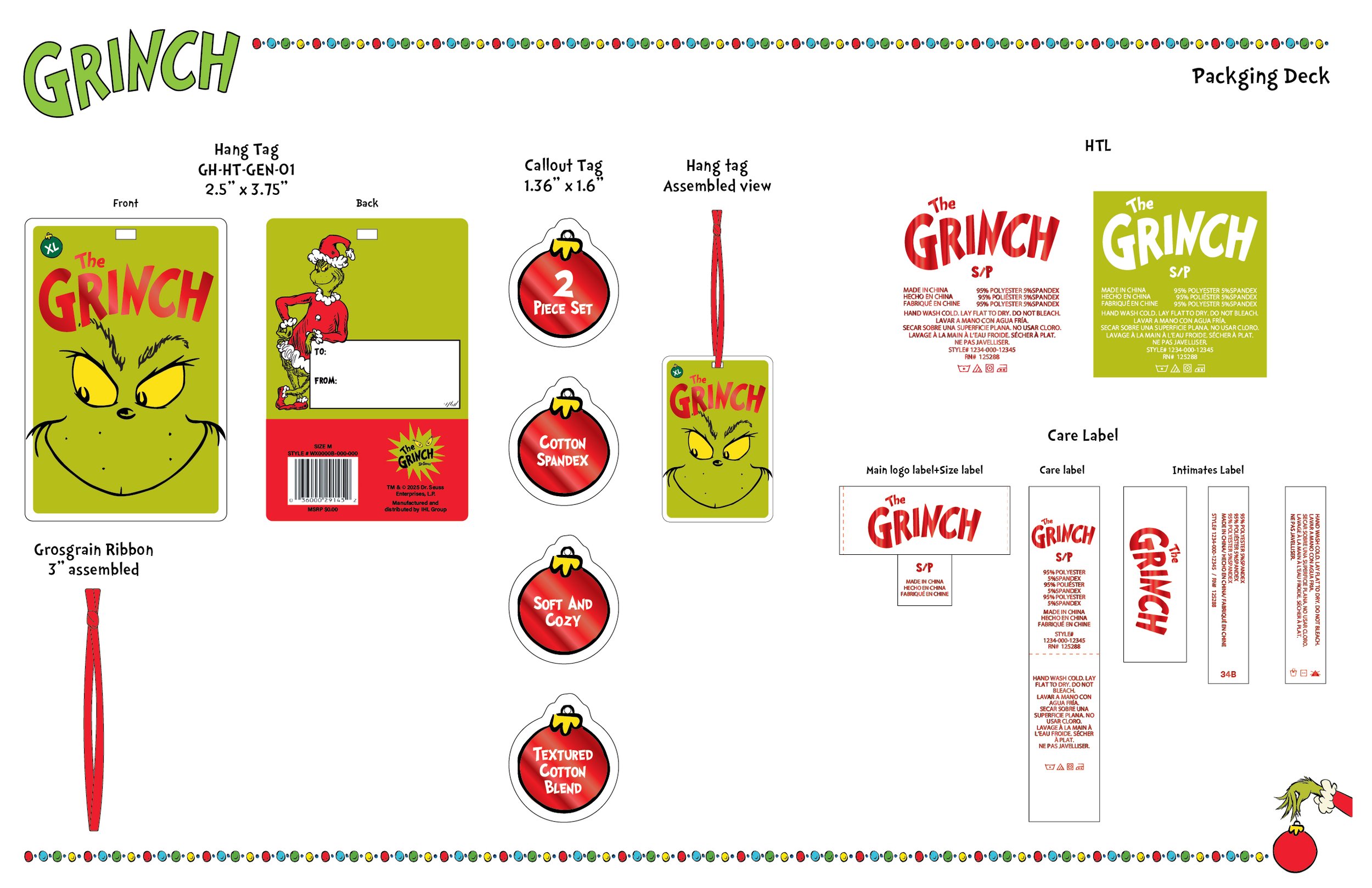 The Grinch packaging deck was created for women’s sleepwear and kids’ sleepwear and apparel. As a holiday-exclusive character, the Grinch is enhanced with red foil accents to add extra festive flair.